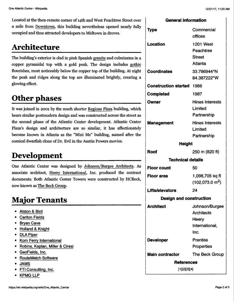 “One Atlantic Center was designed by Johnson/Burgee Architects. As associate architect, Heery International, Inc. produced the contract documents. Both Atlantic Center Towers were constructed by HCBeck, now known as The Beck Group.” Wikipedia